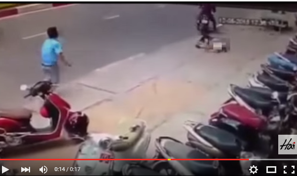 Một tên cướp chạy xe tay ga từ phía sau áp sát cô gái đang đứng trên vỉa hè sau đó hắn giật mạnh chiếc túi. Cô gái chạy theo bị hắn kéo ngã lộn nhào xuống đường. Vụ việc xảy ra mới đây trên đường Bàu Cát (quận Tân Bình, TP HCM).