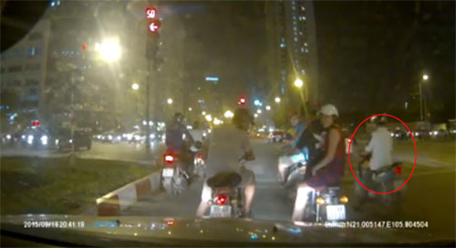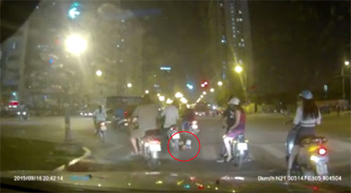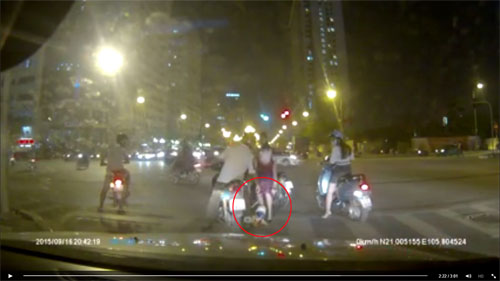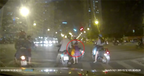 Thấy cháu bé bị ngã, người phụ nữ đi đường vội dừng xe và chạy lại đỡ dậy, trong khi người đàn ông chở cháu bé vẫn ngồi trên xe. Vụ việc xảy ra tối 16/9 tại ngã tư Trung Hòa, Nhân Chính, Hà Nội.