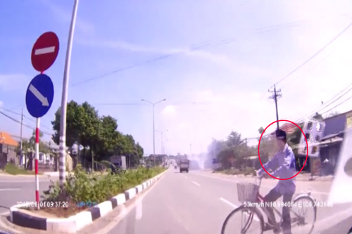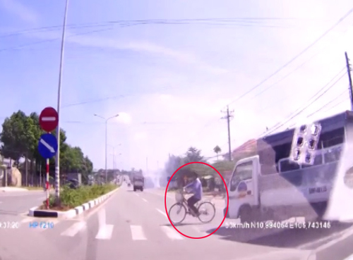 Người đàn ông đi xe đạp cắt mặt qua đầu xe tải sang đường.