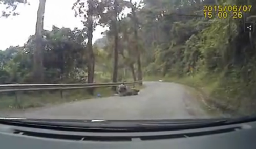 Tài xế điều khiển chiếc xe máy tay ga mất lái và lao và con lượn. Tai nạn xảy ra trên khu vực đi Tam Đảo, rất may con lươn đã giữ 2 người khỏi rơi xuống vực.