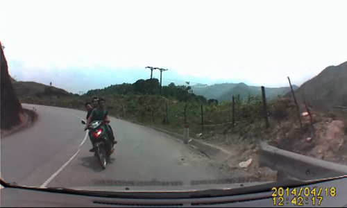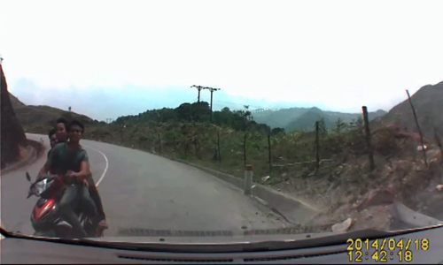 Đang đi ở làn đường ngược chiều, thấy ôtô lao tới, chiếc xe máy chở ba thanh niên không đội mũ bảo hiểm đánh lái sang phải để tránh.