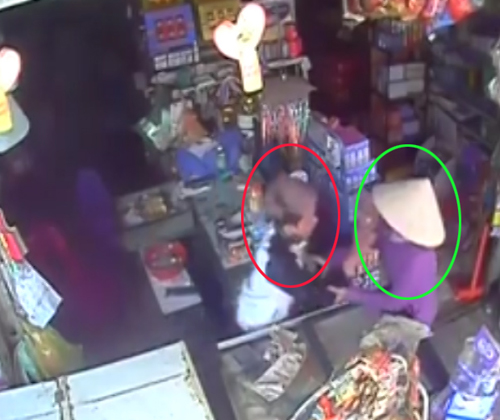 Bà chủ quán chạy vào túm áo tên trộm, lập tức bị hắn xô ngã.