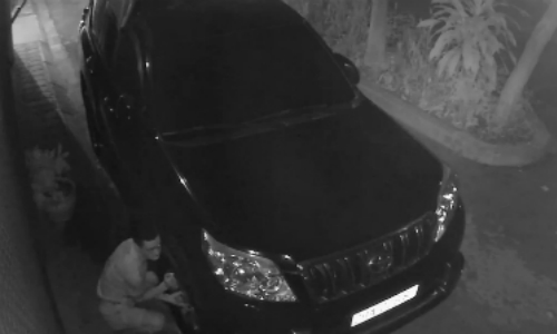 Tên trộm dùng một vật cứng cạy từng logo ở cả 4 bánh chiếc xe Toyota đắt tiền khi xe đang đỗ trong ngõ..