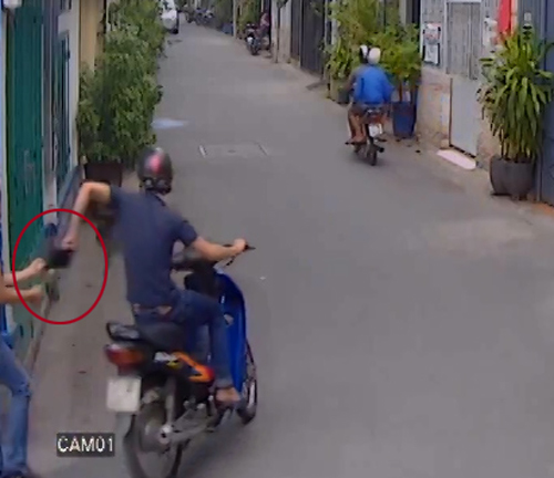 Vừa bước ra đầu ngõ, người phụ nữ cầm chiếc ví trên tay bị tên cướp chạy xe máy phía sau vượt lên giật, rồ ga tháo chạy.