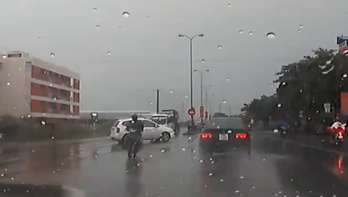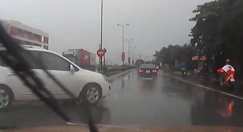 Chiếc Kia Carens từ đường ngược chiều bất ngờ lao sang làn đường đối diện. Pha qua đường "kiểu tự sát" này khiến một xe BWM đang chạy tốc độ cao phải đánh lái né va chạm. Còn tài xế ôtô gắn camera phải bóp còi, nhấn phanh gấp, xe khựng lại sát ngay đầu chiếc Kia Carens. Sau đó anh ta cho xe cập sát chiếc Kia và văng tục với tài xế xe này. Trời lúc này đang mưa, đường trơn nguy hiểm. Nếu hai xe ôtô kia vì tránh Kia mà đánh lái sang phải thì có thể bị tông vào xe tải đang chạy cùng chiều ở làn phía trong.