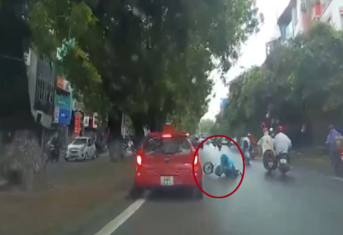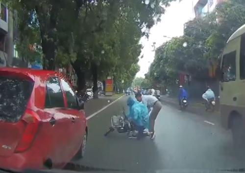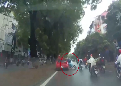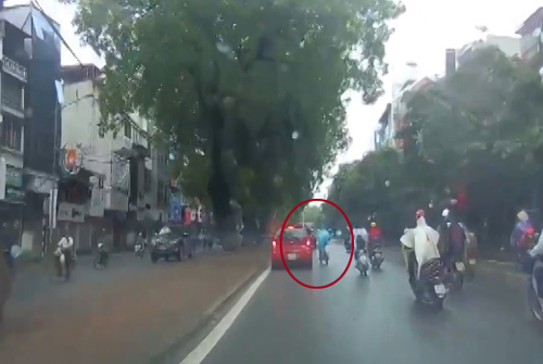 Đoạn clip ghi lại cho thấy, do bị chiếc áo mưa che khuất tầm nhìn nên thiếu nữ không biết chiếc ô tô bên tay phải rồi bất thần sang đường đâm luôn vào hông Kia Morning.