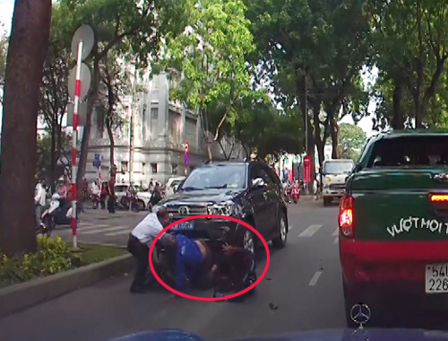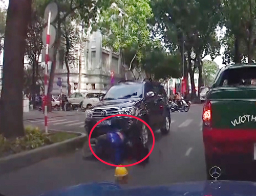 Do sang đường thiếu quan sát, 2 nam thanh niên bị ôtô đâm ngã mắc kẹt dưới gầm xe. Vụ tai nạn xảy ra lúc 8h24 ngày 14/4 trên đường Tôn Đức Thắng, quận 1, TP HCM.