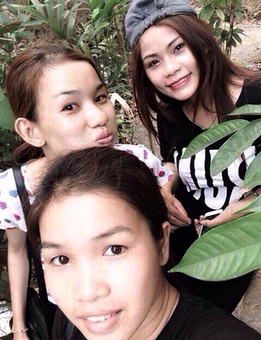 Xim (đội nón) và Ngân, Thuỷ trong bức ảnh trước đó họ chụp. Ảnh:C.A |