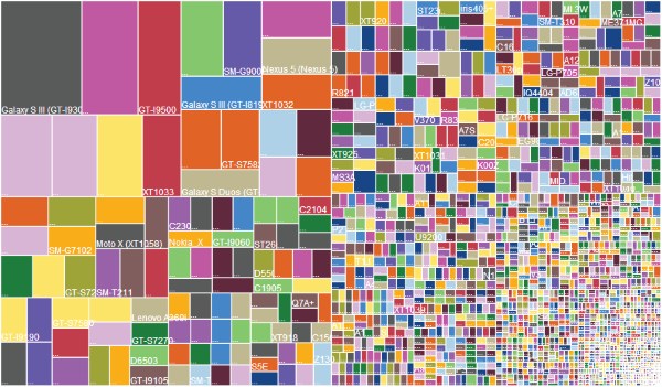 Đây là cách tốt nhất để hình dung sự đa dạng của các thiết bị Android đã tải về ứng dụng OpenSignal trong vài tháng qua. Biểu đồ trên cho thấy những thách thức mà các nhà phát triển Android phải đối mặt, các nhà phát triển phải tối ưu ứng dụng để 18.000 thiết bị có thể sử dụng ngay lập tức. So với năm ngoái, độ phân mảnh đã tăng lên 60%, năm 2013 chỉ có hơn 11.868 thiết bị, năm nay số lượng thiết bị đã tăng lên 18.796. So với hồi năm 2012, lượng thiết bị đã tăng lên gấp bốn lần. Cách đây hai năm chỉ có 3.997 thiết bị Android khác nhau.