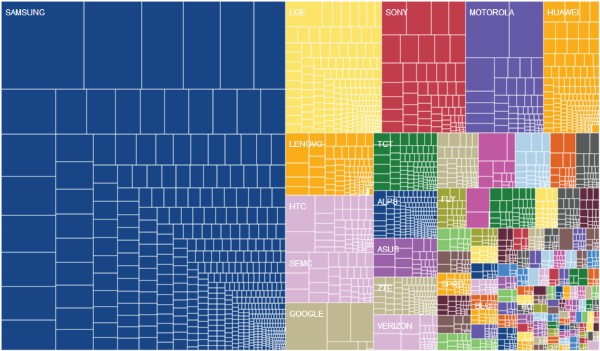 Biểu đồ này cho chúng ta thấy thị trường được sắp xếp theo các nhà sản xuất, và một lần nữa Samsung lại chiếm ưu thế. Trong biểu đồ ở phần trên, 12 trong số 13 thiết bị phổ biến nhất mang thương hiệu Samsung, trong biểu đồ này Samsung chiếm 43% thị phần. Sony đứng thứ hai với 4,8%, Samsung bỏ quá xa so với vị trí thứ hai.