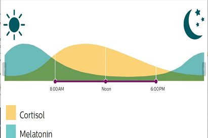 Chu kỳ tiết ra và ức chế của melatonin và cortisol theo nhịp ngày đêm sẽ được thể hiện theo hình sau: