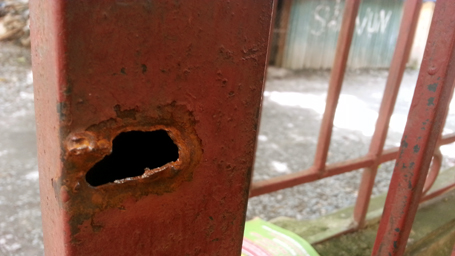 Chỉ vào cánh cổng bị phá tung chốt cài ổ khóa, bác Sơn cho biết, kẻ gian đã lợi dụng trời mưa gió lúc đêm khuya, phá chốt cổng, vào sân phá khóa, trộm mất 3 trong 4 chiếc xe máy của nhà mình thường ngày vẫn để ngoài sân.