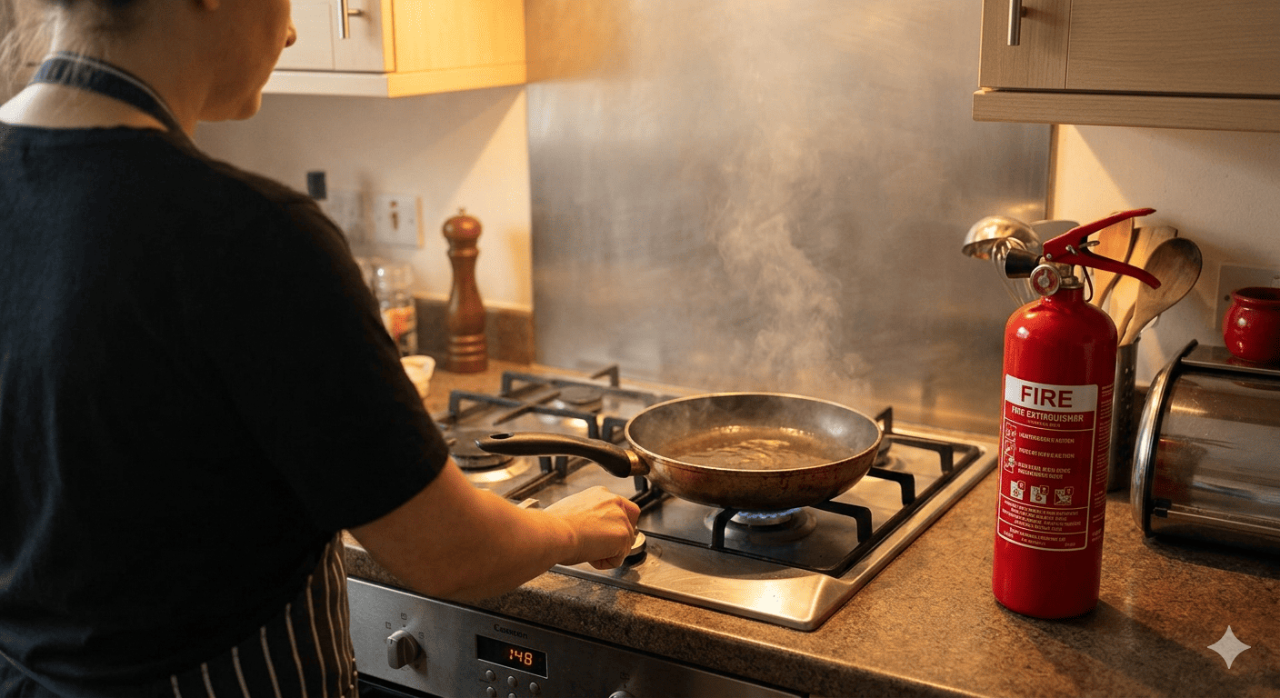 Cẩn thận với dầu mỡ: Nếu chảo dầu bốc cháy, tuyệt đối không dùng nước để dập. Hãy dùng nắp vung đậy lại hoặc dùng bình chữa cháy bột.