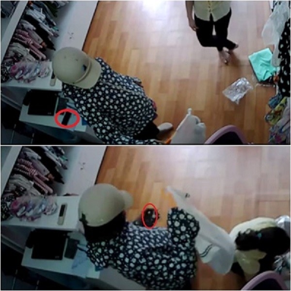 Lợi dụng nhân viên cửa hàng ngồi xuống lấy đồ, "nữ đạo chích" nhanh tay trộm chiếc iPhone màu đen trên bàn thu ngân chỉ trong tích tắc nhưng ngay sau đó đã bị chủ cửa hàng phát hiện.