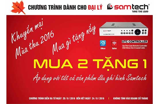Từ ngày 20/9/2016 đến hết ngày 24/9/2016, khi mua 2 đầu ghi cùng loại bất kỳ từ nhãn hàng Samtech, các đại lý sẽ được tặng thêm 1 đầu ghi cùng loại.