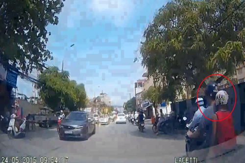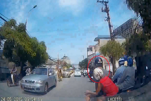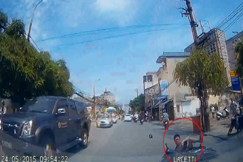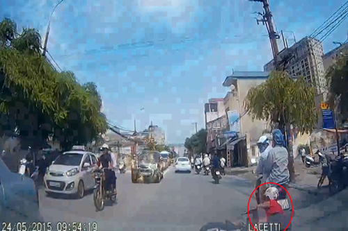 Camera hành trình từ chiếc xe hơi đã ghi lại hình ảnh người đàn ông chở con trên xe máy bất ngờ từ phía sau vượt lên tạt đầu chiếc ôtô. Ngay lập tức, cả 2 bố con bị ôtô đâm ngã nhào xuống đường. Rất may, cậu bé không sao, còn người đàn ông bị thương nhẹ ở chân.