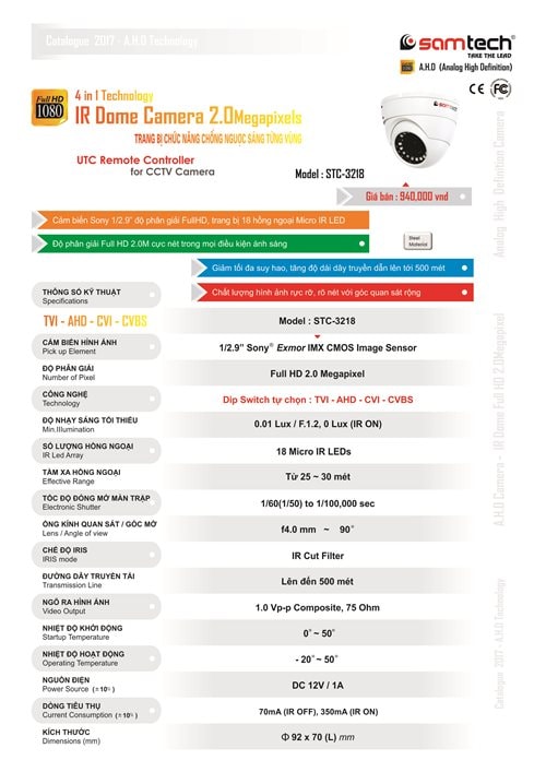 Ứng dụng công nghệ mới, đầu năm 2017, Samtech.vn đã cho ra mắt Camera SAMTECH STC-3218 - Full HD 2.0 Megapixel tích hợp công nghệ 4 trong 1