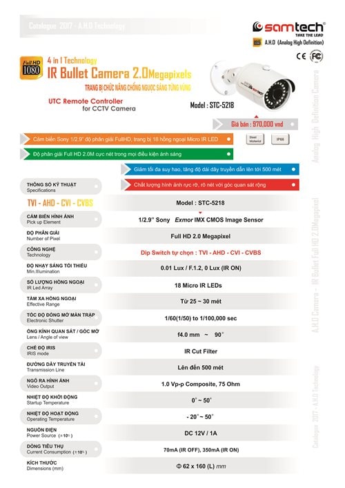 Nhằm đáp ứng nhu cầu của khách hàng một cách tốt nhất, Samtech.vn đã cho ra mắt Camera SAMTECH STC-5218 - Full HD 2.0 Megapixel tích hợp công nghệ 4 trong 1.