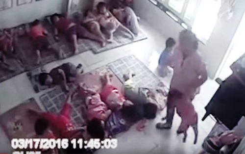Trong khi một số bé đã ngủ, nhiều cháu còn đùa giỡn. Nữ giáo viên hơn 30 tuổi, bụng bầu, mặc áo hồng đến xách tay, nhấc bổng bé gái 2 tuổi đang nằm ngoài chiếu, hất vào chỗ ngủ. Những đứa trẻ khác tỏ vẻ hoảng sợ, lật đật chạy vào chỗ mình. Một lúc sau, cô này ném chiếc cặp vào mặt bé khác.