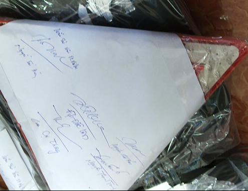 Biển báo hình tam giác rơi lại hiện trường sau vụ tai nạn, tang vật giúp cảnh sát tìm ra tài xế xe đầu kéo tông chết hai mẹ con bà Huế. Ảnh: H.Minh. |