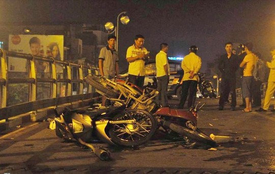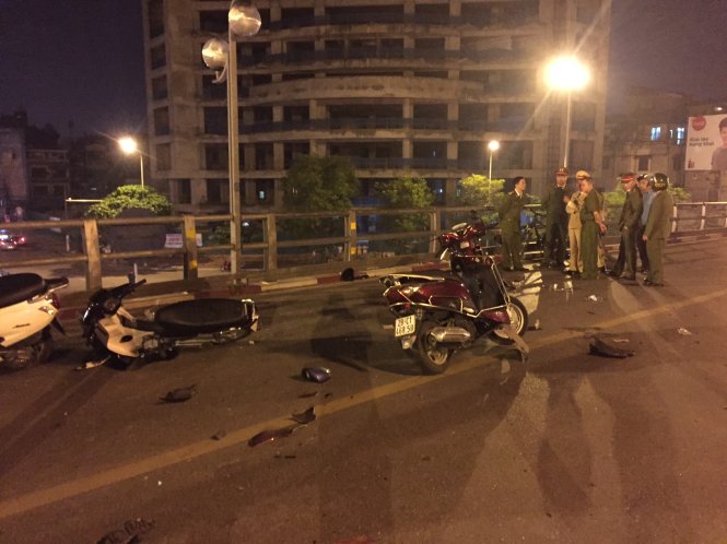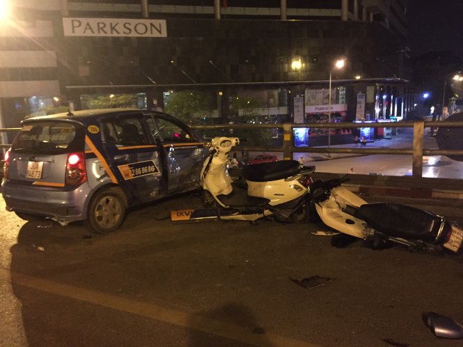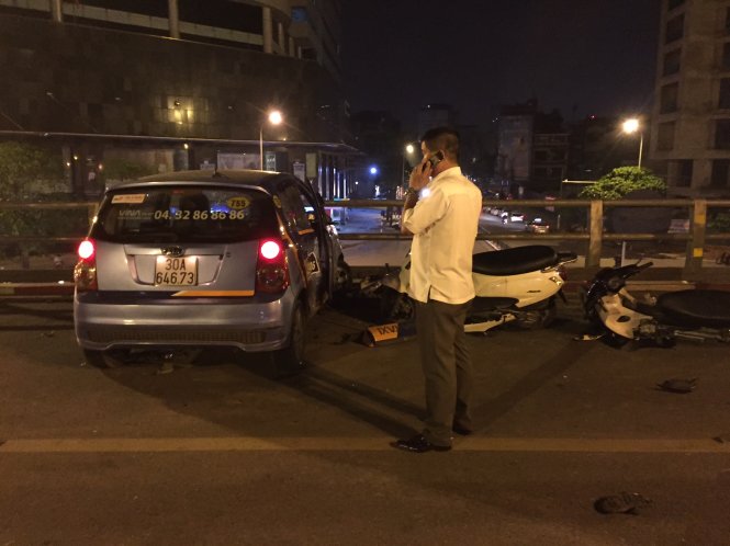Khoảng gần 23h đêm 8/11, taxi của hãng Vinataxi chạy theo hướng từ Ngã Tư Sở, đến đoạn giữa cầu vượt Thái Hà - Chùa Bộc (thuộc Q.Đống Đa, Hà Nội) thì đâm vào một số xe máy đang chạy trên cầu.