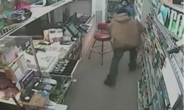 Hình ảnh được ghi lại qua hệ thống camera an ninh tại một siêu thị nhỏ, cho thấy một nữ nhân viên đã dũng cảm đánh đuổi hai tên cướp khi hai tên này tiến vào cửa hàng vơ vét tiền trong két.