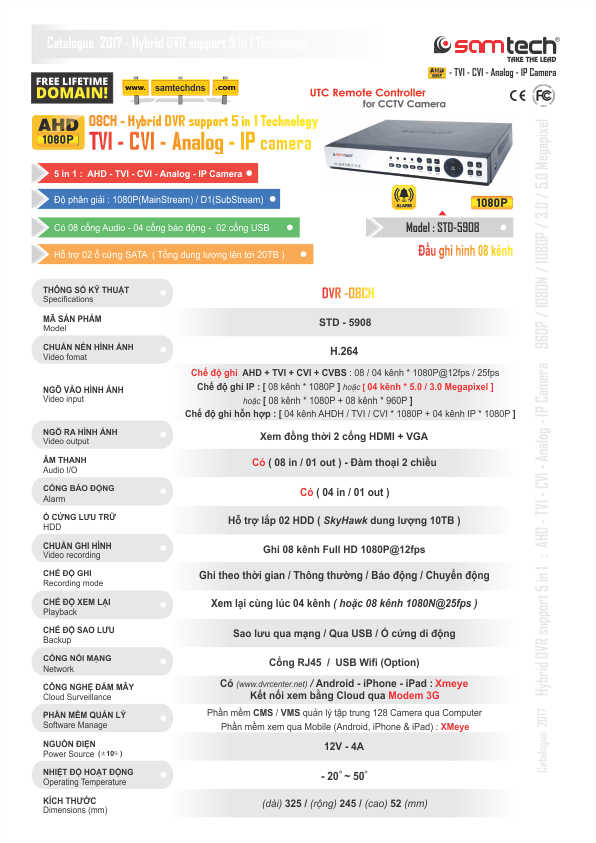 Đầu ghi có hỗ trợ tên miền miễn phí samtechdns.com. Bạn có thể xem camera qua phần mềm CMS hoặc VMS trên máy tính hoặc phần mềm XMeye trên smartphone.