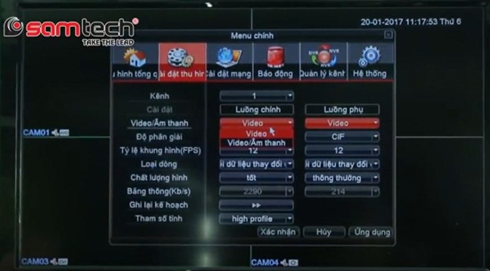 Bước 2: Vào muc Video/Âm thanh: Sẽ có 2 lựa chọn là Video và Video âm thanh. Nếu không gắn mic, bạn chọn video; nếu gắn mic, bạn chọn video âm thanh (lưu ý: chọn ở cả 2 luồng chính và phụ)