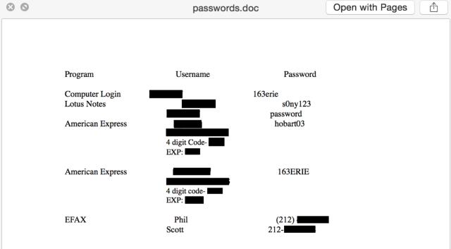 Trong số dữ liệu mà hacker chiếm được cũng có một thư mục được đặt tên là "password". Bên trong đó có tập tin văn bản "password.doc", được tạo từ ngày 2/3/2011, chứa tên tài khoản, mật khẩu và thậm chí cả số thẻ tín dụng của nhân viên.