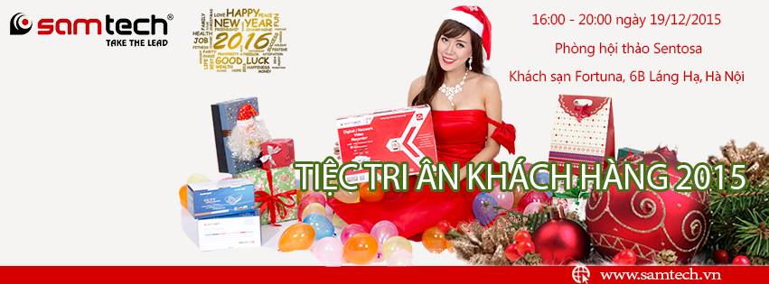 Hội nghị tri ân khách hàng thương hiệu Samtech 2015 sẽ diễn ra vào lúc 16h00 đến 20h00 ngày 19/12/2015 tại Khách sạn Fortuna 6B Láng Hạ, Hà Nội.