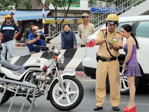 Nữ tài xế lái chiếc xe gây tai nạn xuất trình giấy tờ xe cho CSGT kiểm tra.