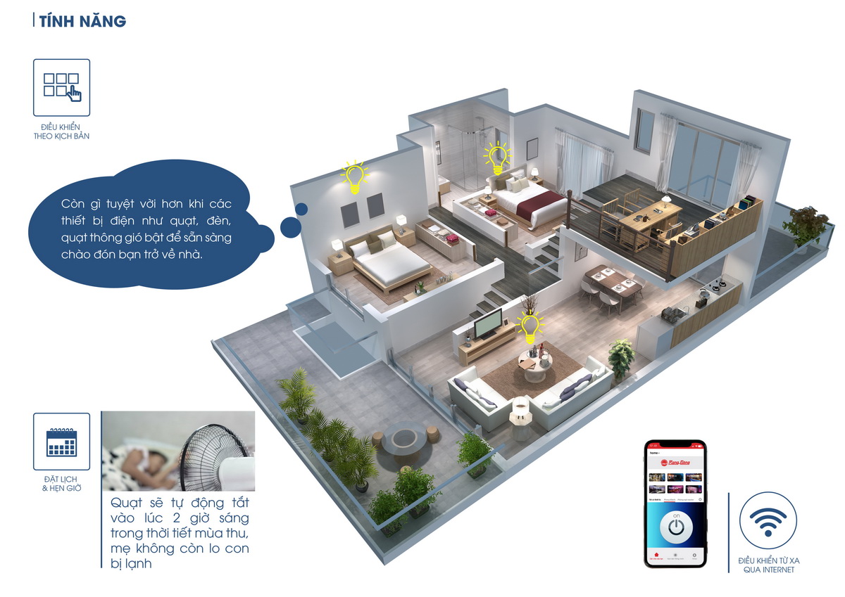 - Phần mềm điều khiển cài đặt trên smartphone tương thích với cả Hệ điều hành Android và IOS