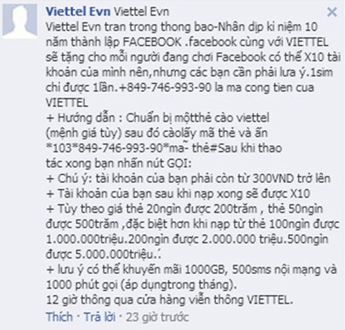 Lấy tên Facebook là Viettel Evn đưa ra thông báo để dụ dỗ người dùng