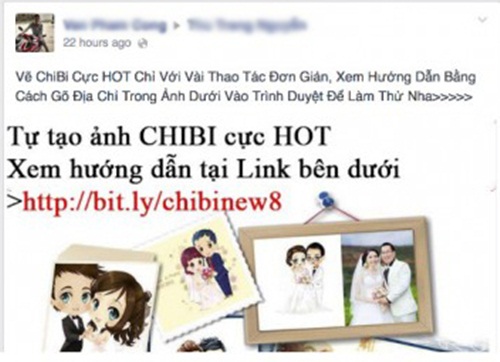 Đánh vào tâm lý tò mò và thích sự mới lạ của nhiều người, kẻ xấu chia sẻ lên tường của người dùng lời mời chào hấp dẫn kèm theo link quảng cáo về một hình ảnh vẽ chân dung, chibi hay clip về nữ sinh…