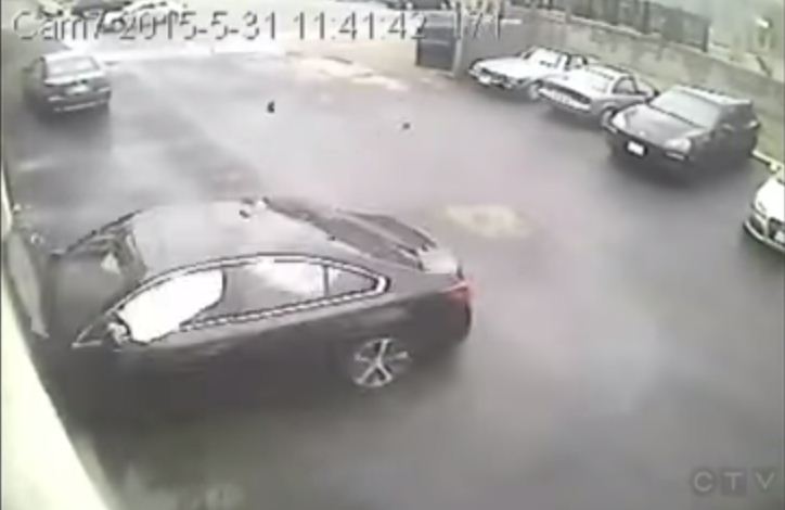 Chiếc sedan từ đâu xuất hiện ở tư thế không khác gì máy bay khi vọt qua hàng rào ở độ cao khoảng 10 m rồi đâm sầm vào cửa garage của một cửa hàng sửa chữa ôtô tại Canada. Các camera giám sát ghi lại 2 góc khác nhau của tai nạn, cho thấy chiếc Subaru Legacy bay qua đầu một chiếc Porsche Cayenne và Audi TT roadster đang đỗ sát hàng rào. Cảnh sát cho rằng tài xế đã nhầm chân phanh và chân ga, theo CTV News. Không rõ có bao nhiêu người trên xe nhưng duy nhất tài xế bị thương.