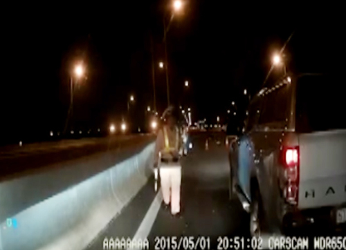Camera hành trình của một xe ôtô đã ghi lại những hình ảnh một chiếc ôtô bán tải đang chạy tốc độ cao trên đường Long Thành - Dầu Giây thì dừng đột ngột vì thấy cảnh sát giao thông rọi đèn.