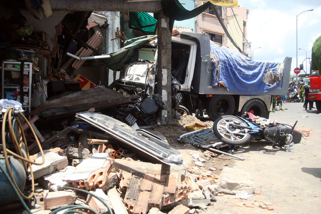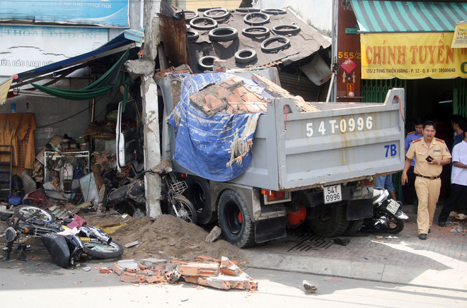 Chiếc xe ben lao nhanh vào lề, cuốn hàng loạt xe tay ga của cửa hàng bán xe máy và tông thẳng vào căn nhà cấp 4 vừa là tiệm sửa xe vừa bán cà phê của bà Bùi Thị Phước (62 tuổi).