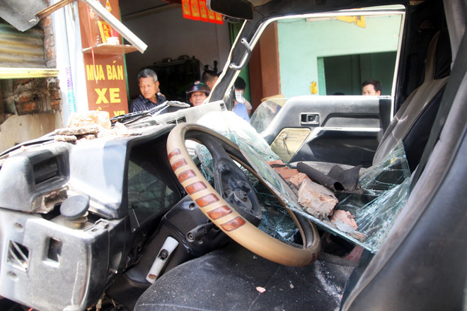 Đầu xe ben hư hỏng nặng, kính xe bể, tường căn nhà lọt vào bên trong cabin. Sau tai nạn, tài xế Trực bị tạm giữ, còn phụ xe bỏ trốn.