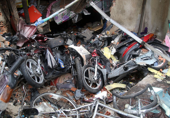 Hơn một tiếng sau khi xe ben tông sập nhà ở quận 8, TP HCM, hai thi thể được đưa ra ngoài, hơn chục xe máy bị cán nát.