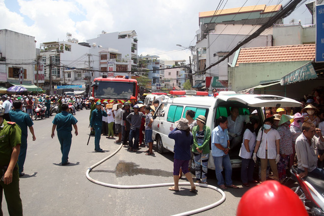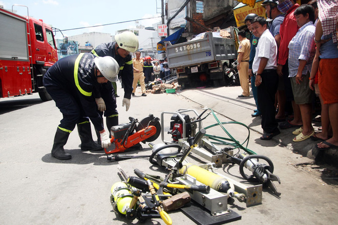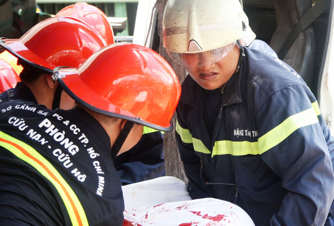 Lực lượng cứu hộ - cứu nạn, Cảnh sát PCCC TP HCM được huy động cùng nhiều thiết bị để cắt cửa xe ben, lôi những xe máy kẹt cứng dưới gầm ra để tìm thi thể nạn nhân.