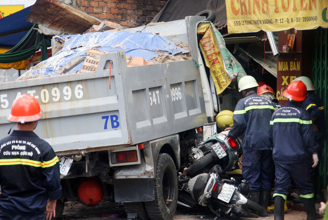 Hơn 9h, xe ben có trọng tải gần 2 tấn chở đầy cát do tài xế Hồ Văn Trực (26 tuổi, quê Bạc Liêu) chạy từ huyện Bình Chánh về quận 8. Khi đổ dốc cầu Nhị Thiên Đường để xuống đường Tùng Thiện Vương, xe trôi tự do trên đường. Tài xế Trực và phụ xe Dương (36 tuổi, ngụ Cần Thơ) đã hô hoán để dòng xe chạy dưới dốc cầu tháo chạy.