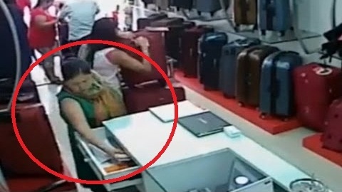 Đầu tiên, người phụ nữ này đi vào cửa hàng vờ chọn va-li, sau đó lợi dụng không ai để ý, thản nhiên mở hộc tủ lấy trộm tiền, nhét vào trong ngực. Tuy nhiên, hành động này đã bị camera ghi lại