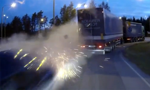 Xe đầu kéo vào cua từ tốn, bỗng xe ngược chiều từ đâu lao tới sượt qua đuôi với va chạm làm bắn ra vô số tia lửa. Dường như nhân vật bí ẩn đã lao thẳng qua vòng xuyến trước khi lao vào xe đầu kéo.