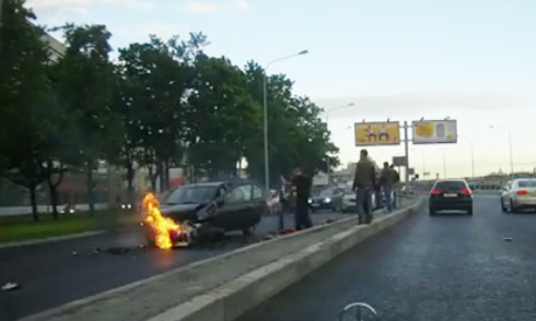 Chiếc môtô lao vọt lên và vượt một loạt ôtô cùng chiều và mất hút khỏi tầm quan sát của chiếc Mercedes gắn camera hành trình. Nhưng ở đoạn cua ngay trước đó, camera ghi lại được cảnh một người nằm bất động và cách vài mét là xe máy nằm trước đầu ôtô ngược chiều. Lửa le lói từ chiếc xe máy vỡ nát và sau đó bùng lên dữ dội.