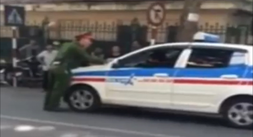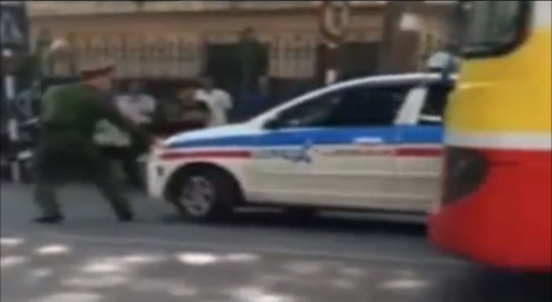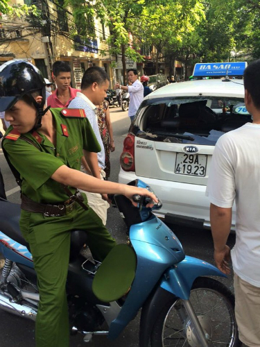 Sự việc xảy ra vào sáng ngày 3/6 tại ngã tư Quán Sứ - Tràng Thi (quận Hoàn Kiếm, Hà Nội). Một taxi bị công an phường dừng xe kiểm tra. Trong lúc người công an đang gọi hỗ trợ, tài xế taxi bất ngờ tăng ga cho xe lao thẳng bỏ chạy.