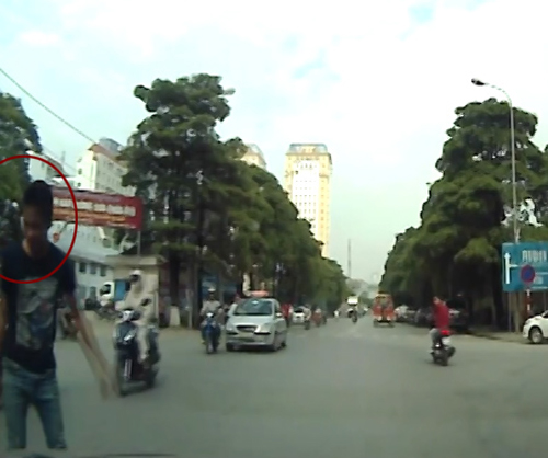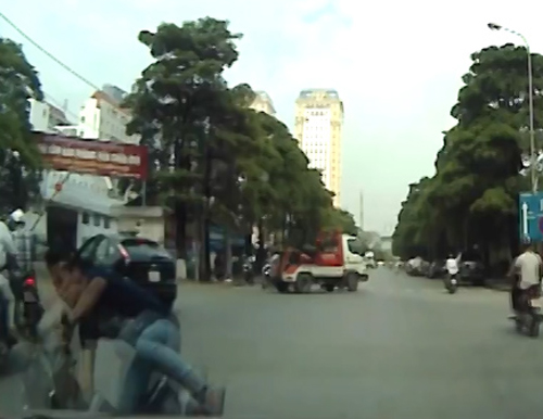 Bất ngờ, anh ta đâm vào đầu ôtô camera hành trình ngã nhào xuống đường.