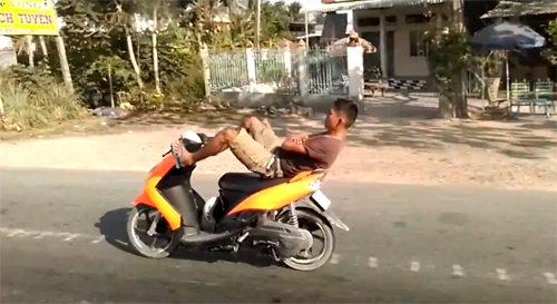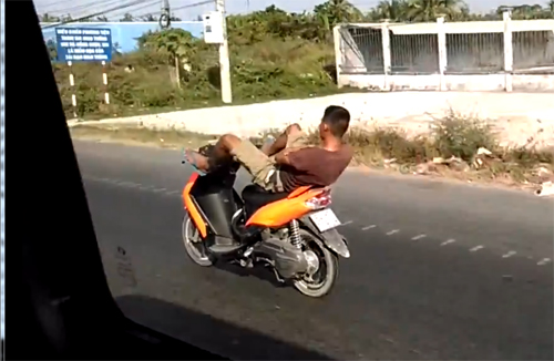 Không những không đội mũ bảo hiểm, thanh niên này còn nằm dài trên xe, điều khiển xe máy bằng chân.