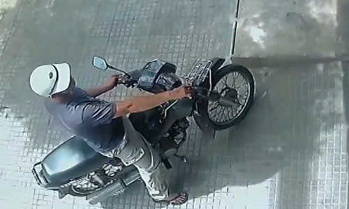 Tên trộm mặc áo thun, đi xe máy đứng trước cửa quán quan sát.