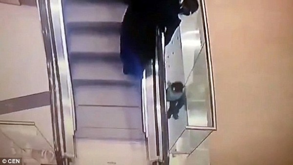 Tuy nhiên, khi bé tuột tay khỏi tay vịn mép thang máy thì người dì mất thế và không thể giữ tay bé được lâu.