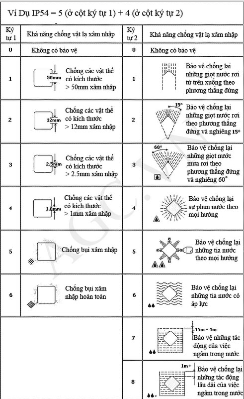 - Chữ số 6 thứ hai đánh giá khả năng chống lại nước (số 6 có nghĩa là chống lại được nước phun trực tiếp có áp lực cao vào thiết bị)